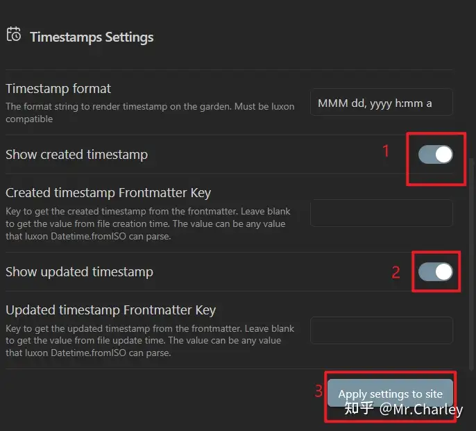 同样在Manage appearance打开的页面,往下拉,找到Timestamps Settings并作如下配置: