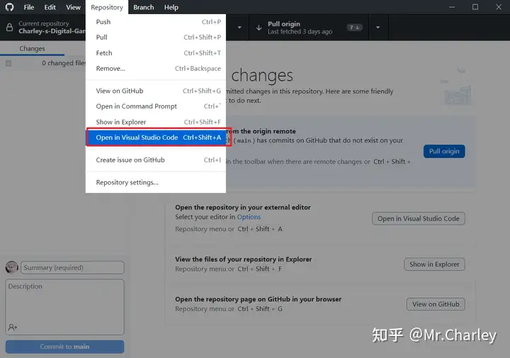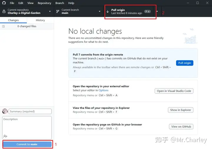直接打开Github Desktop,定位到数字花园的仓库,按照如下操作即可。