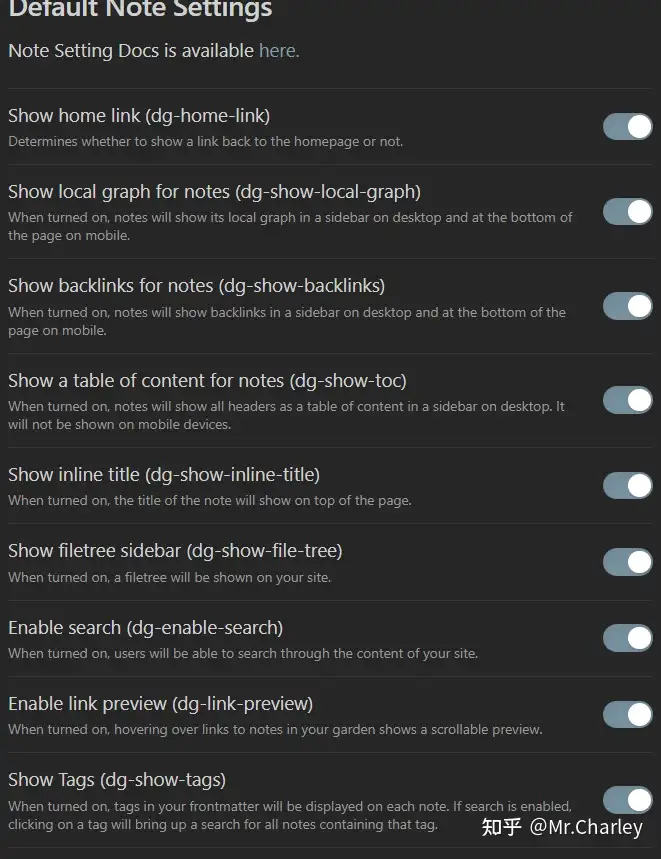 同样在Digital Garden插件的设置页面,找到Global Note Settings —> Manage note settings ,打开笔记设置页面,建议将这个页面的所有设置都打开。